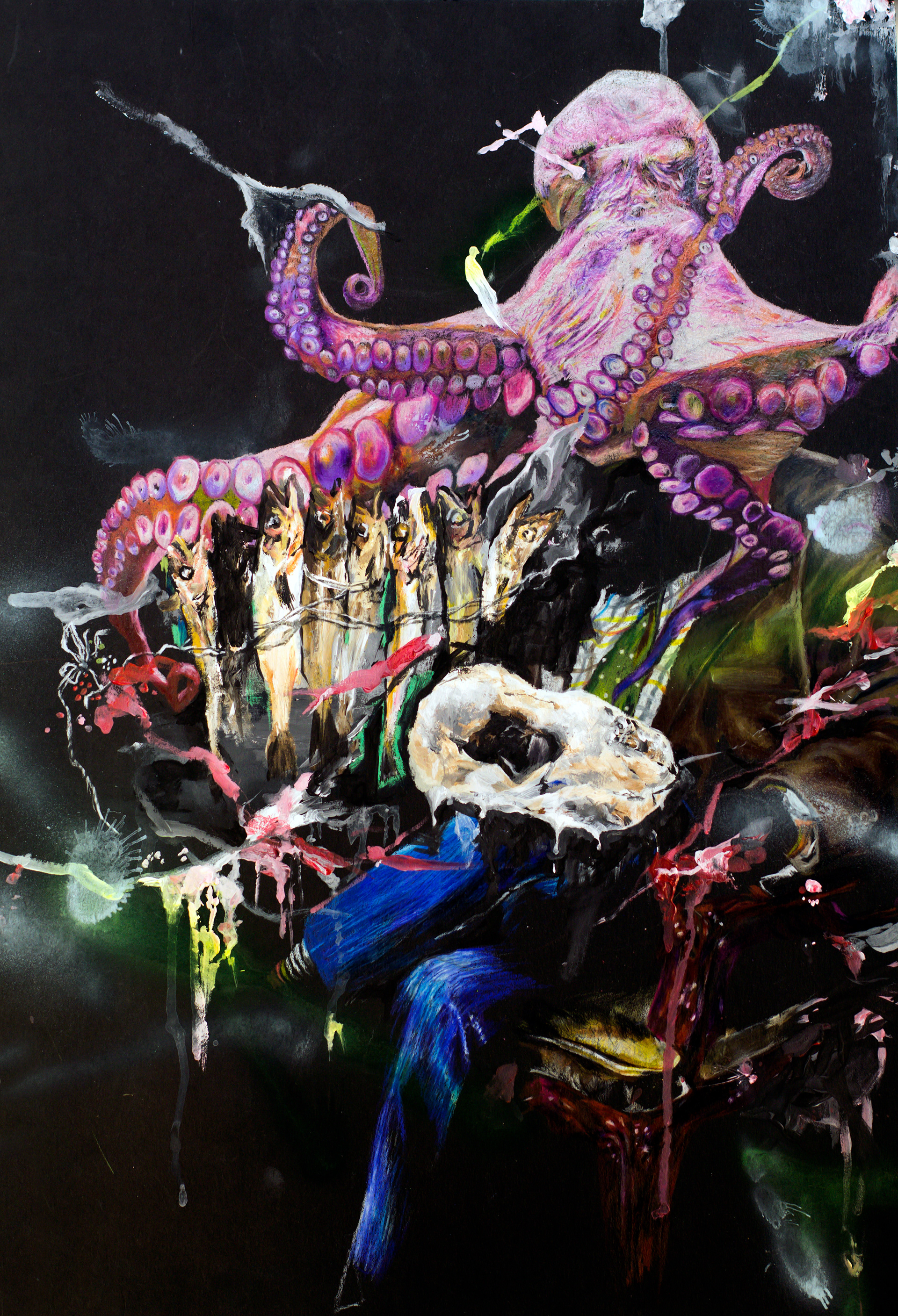 Medium: Color pencil, acrylics, spray paint on illustration board