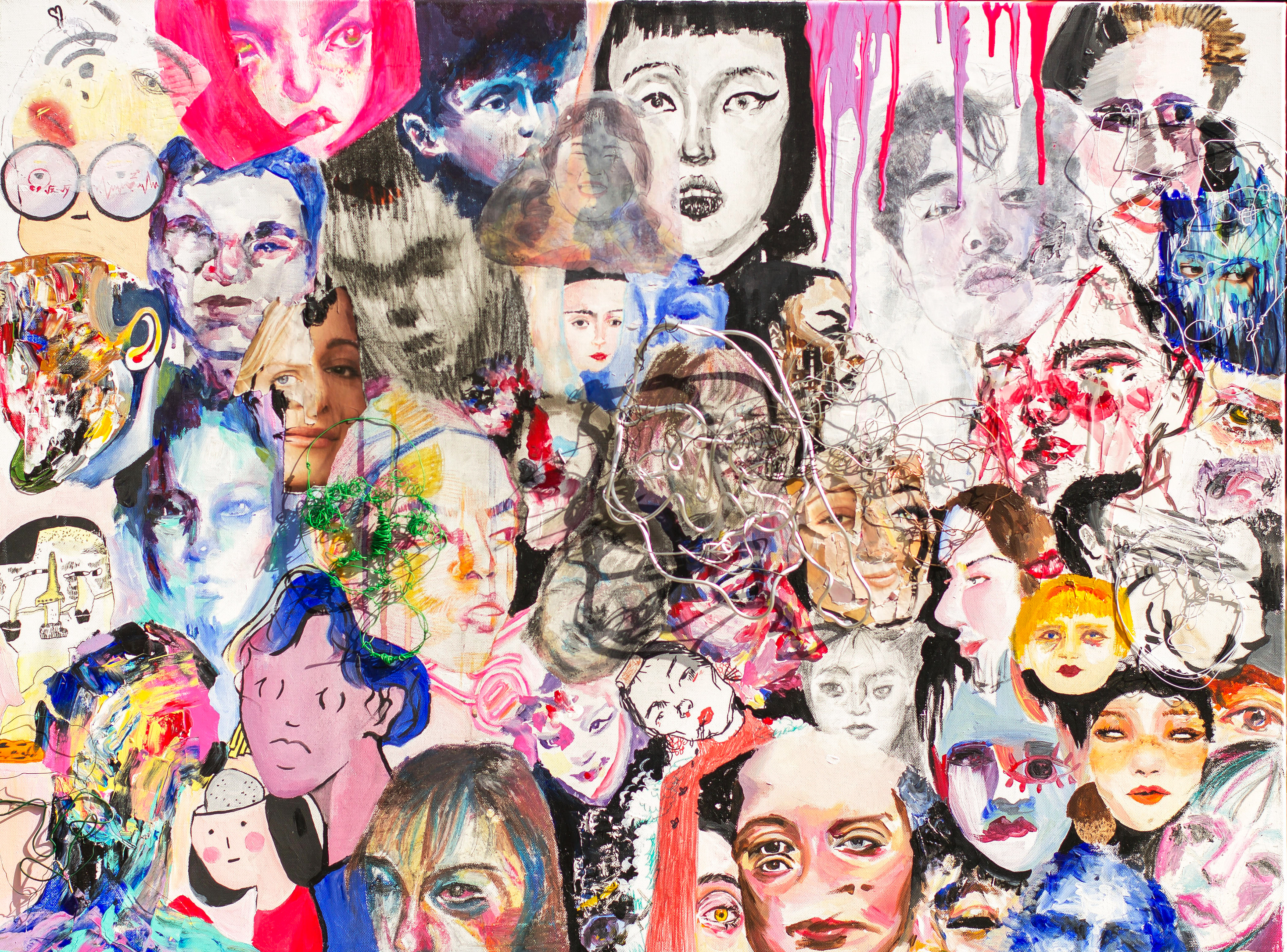 Medium: Acrylics, oil pastel, charcoal, print, wire, and marker on canvas